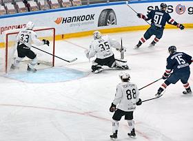 Континентальная хоккейная лига (КХЛ). Плей-офф. Финал-Восток. 2-й матч. Матч между командами "Металлург Мг" (Магнитогорск) - "Трактор" (Челябинск) на стадионе "Арена-Металлург". Вратарь команды "Металлург Мг" Василий Кошечкин (второй справа) во время матча.