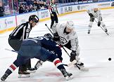 Континентальная хоккейная лига (КХЛ). Плей-офф. Финал-Восток. 2-й матч. Матч между командами "Металлург Мг" (Магнитогорск) - "Трактор" (Челябинск) на стадионе "Арена-Металлург". Игрок команды "Металлург Мг" Денис Зернов (справа) и игрок команды "Трактор" Томаш Гика (слева) во время матча.