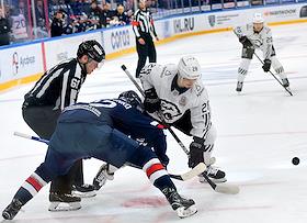 Континентальная хоккейная лига (КХЛ). Плей-офф. Финал-Восток. 2-й матч. Матч между командами "Металлург Мг" (Магнитогорск) - "Трактор" (Челябинск) на стадионе "Арена-Металлург". Игрок команды "Металлург Мг" Егор Яковлев (второй слева) и игрок команды "Трактор" Лоуренс Пилут (второй справа) во время матча.