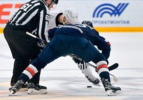 Континентальная хоккейная лига (КХЛ). Плей-офф. Финал-Восток. 2-й матч. Матч между командами "Металлург Мг" (Магнитогорск) - "Трактор" (Челябинск) на стадионе "Арена-Металлург". Игрок команды "Металлург Мг" Григорий Дронов (слева) и игрок команды "Трактор" Алексей Бывальцев (в центре) во время матча.