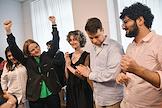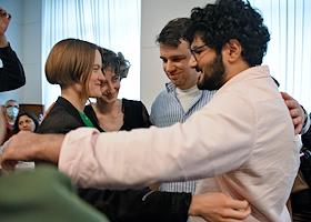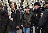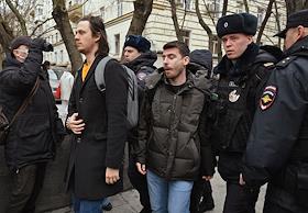 Announcement of the verdict in the criminal case against the editors of the student publication Doxa Armen Aramyan, Natasha Tyshkevich, Vladimir Metelkin and Alla Gutnikova in the Dorogomilovsky District Court. Editor-in-chief of the student magazine DOXA Armen Aramyan (center) and editor of the student magazine DOXA Alla Gutnikova (second from left) after the court session.