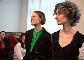Announcement of the verdict in the criminal case against the editors of the student publication Doxa Armen Aramyan, Natalia Tyshkevich, Vladimir Metelkin and Alla Gutnikova in the Dorogomilovsky District Court. Editors of the student magazine DOXA Natalya Tyshkevich (left) and Alla Gutnikova (right) during a court session.