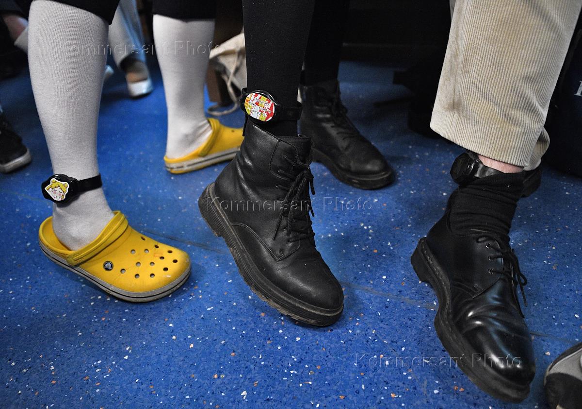 Оглашение приговора по уголовному делу в отношении редакторов студенческого издания Doxa Армена Арамяна, Натальи Тышкевич, Владимира Метелкина и Аллы Гутниковой в Дорогомиловском районном суде. Жанровая фотография. Ноги участников процесса в электронных браслетах во время заседания суда.