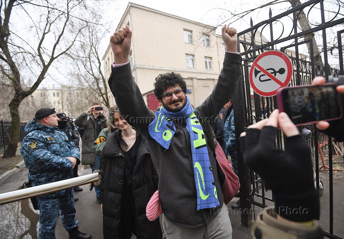 Announcement of the verdict in the criminal case against the editors of the student publication Doxa Armen Aramyan, Natasha Tyshkevich, Vladimir Metelkin and Alla Gutnikova in the Dorogomilovsky District Court. Editor-in-chief of the student magazine DOXA Armen Aramyan (center), editors of the student magazine DOXA Alla Gutnikova (fourth from left) and Vladimir Metelkin (left) after the end of the court session.