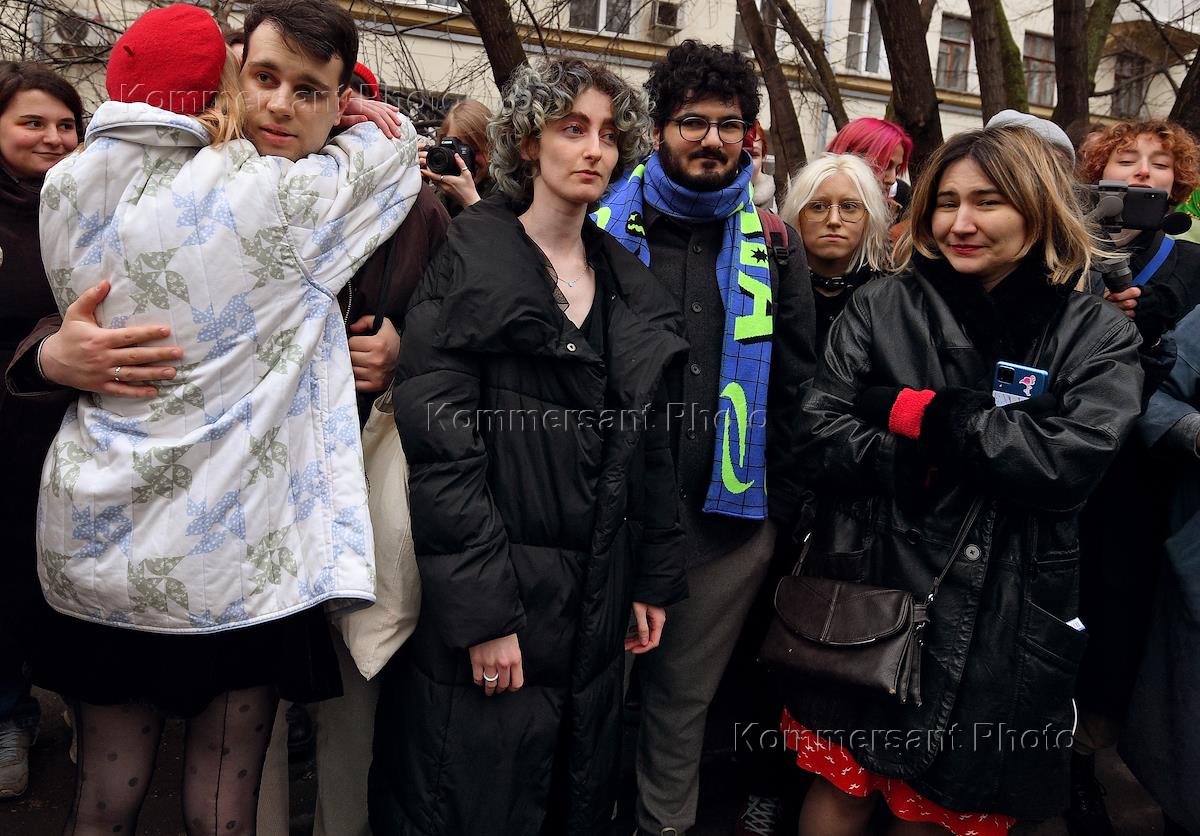 Announcement of the verdict in the criminal case against the editors of the student publication Doxa Armen Aramyan, Natasha Tyshkevich, Vladimir Metelkin and Alla Gutnikova in the Dorogomilovsky District Court. Editor-in-chief of the student magazine DOXA Armen Aramyan (center), editors of the student magazine DOXA Alla Gutnikova (fourth from left) and Vladimir Metelkin (left) after the end of the court session.
