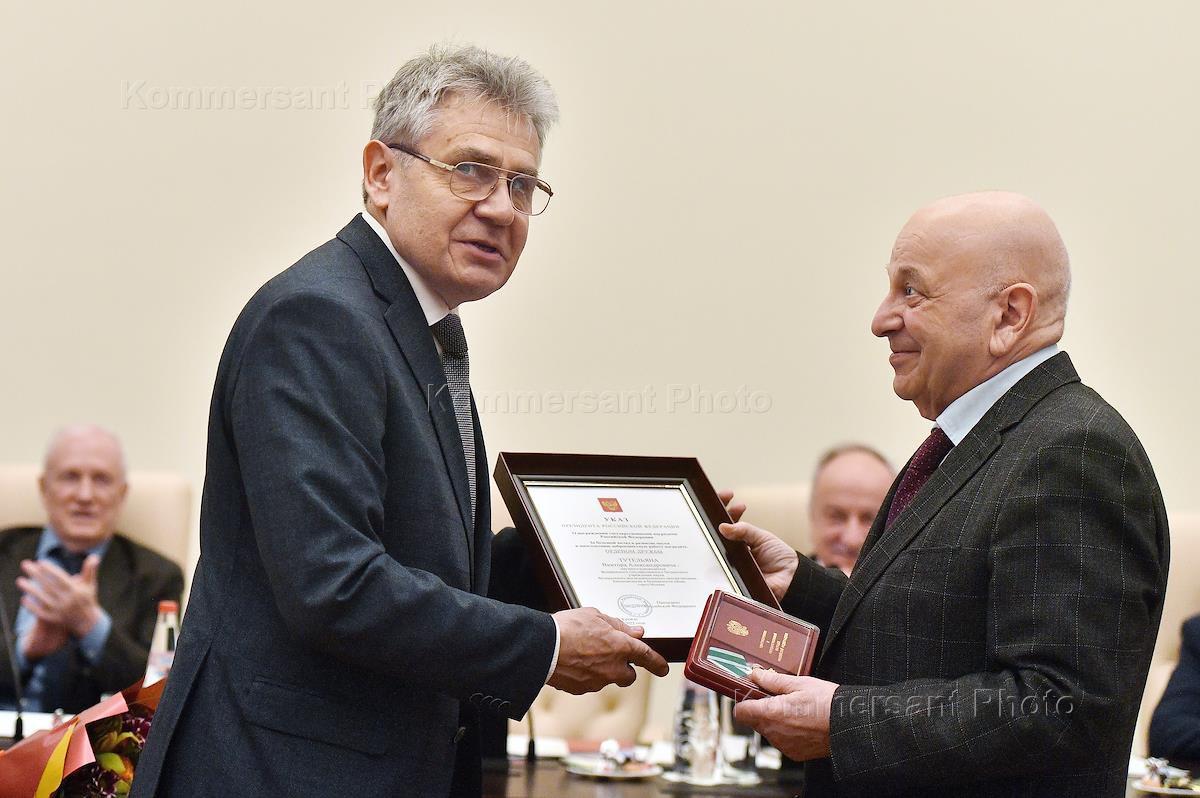 Заседание Президиума Российской академии наук (РАН). Президент РАН Александр Сергеев (слева) и академик РАН, научный руководитель ФГБУН "Федеральный исследовательский центр питания, биотехнологии и безопасности пищи" Виктор Тутельян (справа) во время заседания.