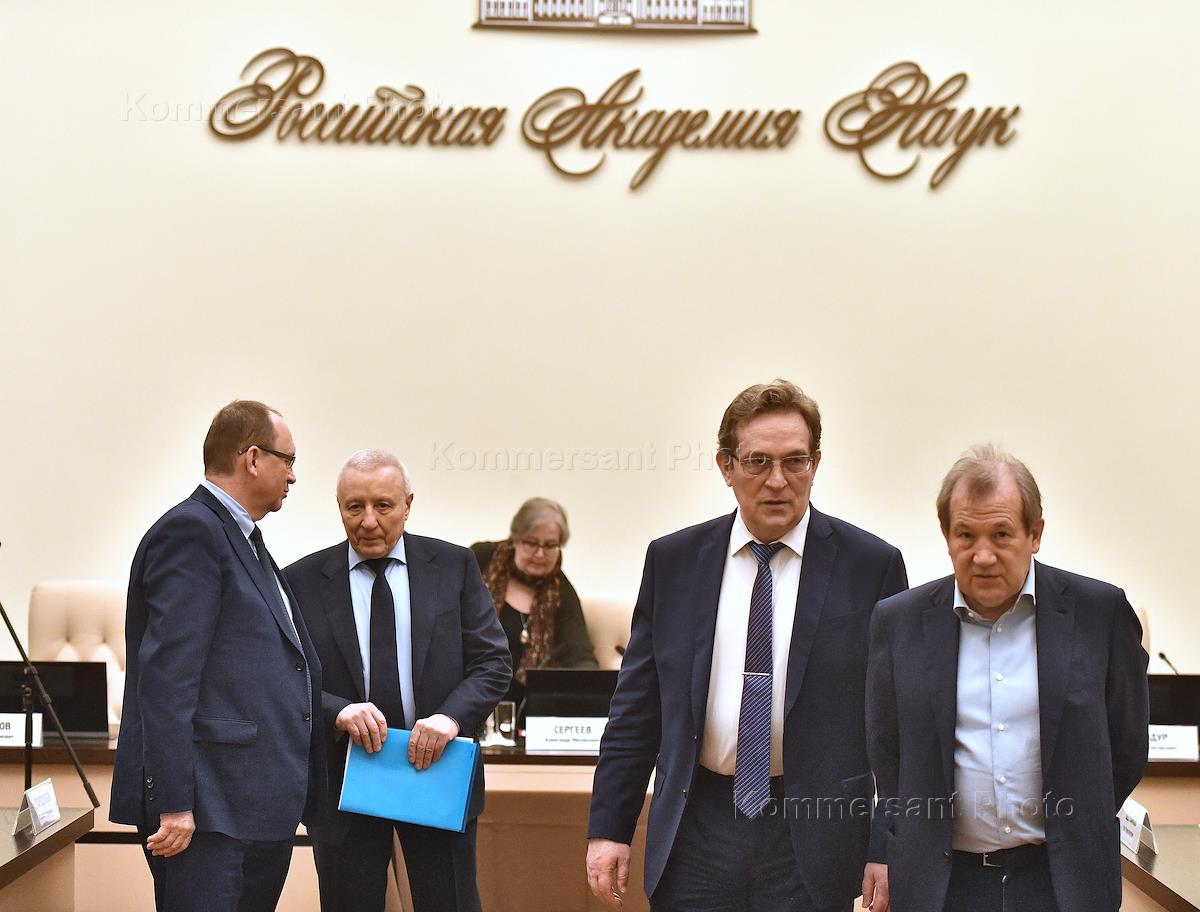 Заседание Президиума Российской академии наук (РАН). Заведующий лабораторией отдела астрофизики высших энергий Института космических исследований РАН, профессор Александр Лутовинов (слева), вице-президент РАН, профессор Алексей Хохлов (в центре), академики РАН Борис Порфирьев (в центре) и Всеволод Ткачук (второй слева) перед началом заседания.