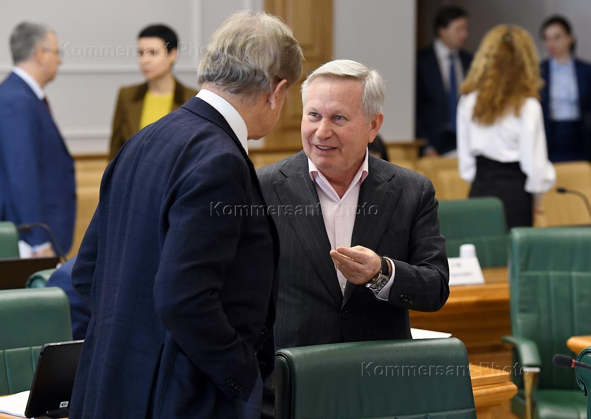 Meeting of the Committee of the Federation Council of Russia on constitutional legislation and state building in the Federation Council of Russia. Representative in the Federation Council of Russia from the executive body of state power of the Stavropol Region Mikhail Afanasov (left) and representative to the Federation Council of Russia from the legislative (representative) body of state power of the Perm Region Alexei Pushkov (right) before the meeting.