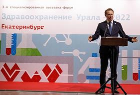 Церемония открытия выставки-форума "Здравоохранение Урала – 2022" на площадке МВЦ "Екатеринбург-ЭКСПО". Министр здравоохранения России Михаил Мурашко во время церемонии.