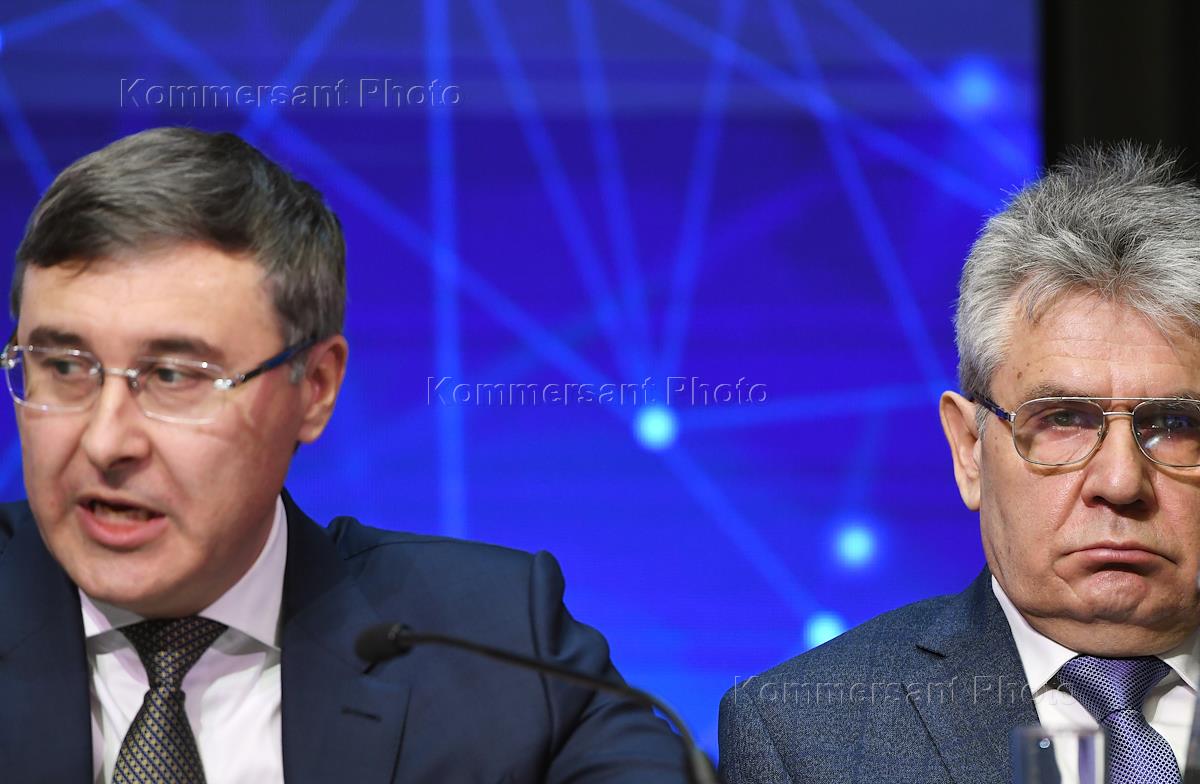 Международная научно-практическая конференция "Цифровые международные отношения 2022" в МГИМО. Министр науки и высшего образования России Валерий Фальков (слева) и президент Российской Академии наук (РАН) Александр Сергеев (справа) во время конференции.