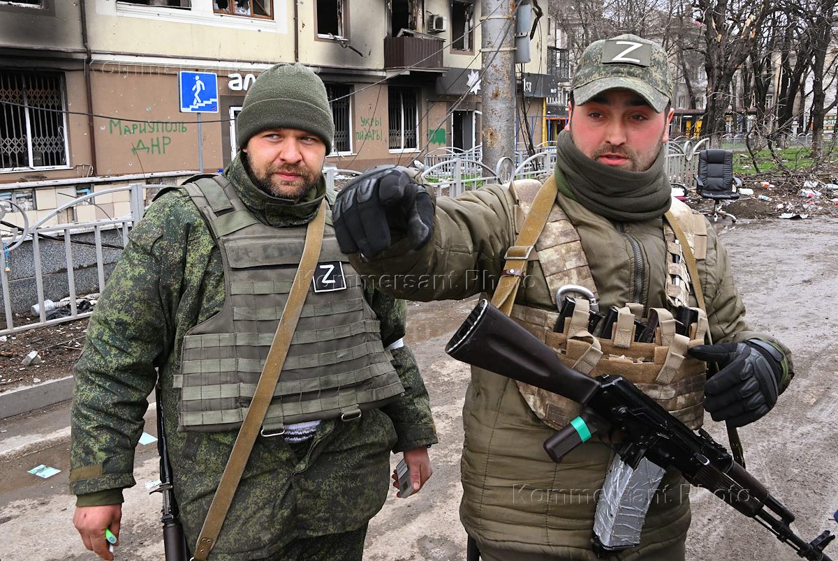 Проведение специальной военной операции Вооруженных Сил России на Украине. Ситуация в Мариуполе. Бойцы военной милиции ДНР на одной из улиц города.