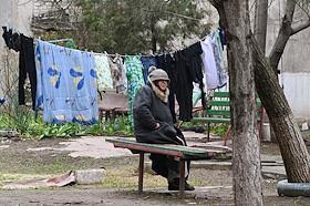 Проведение специальной военной операции Вооруженных Сил России на Украине. Ситуация в Мариуполе. Пожилая женщина во дворе жилого дома в Правобережном районе города.