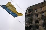 Проведение специальной военной операции Вооруженных Сил России на Украине. Ситуация в Мариуполе. Флаг Украины на фоне пострадавшего от обстрелов многоэтажного жилого дома.