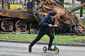 Проведение специальной военной операции Вооруженных Сил России на Украине. Ситуация в Мариуполе. Гусеница сгоревшего танка на одной из улиц города.