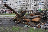 Проведение специальной военной операции Вооруженных Сил России на Украине. Ситуация в Мариуполе. Сгоревший танк на одной из улиц города.