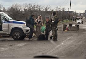 Проведение специальной военной операции Вооруженных Сил России на Украине. Ситуация в Мариуполе. Люди идут с вещами на улице в Правобережном районе города.