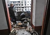Проведение специальной военной операции Вооруженных Сил России на Украине. Ситуация в Мариуполе. Местные жители разжигают костер на балконе поврежденного во время боевых действий жилого дома в Правобережном районе города.