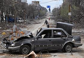 Проведение специальной военной операции Вооруженных Сил России на Украине. Ситуация в Мариуполе. Разбитый легковой автомобиль на одной из улиц в Правобережном районе города.