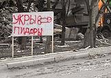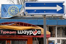Проведение специальной военной операции Вооруженных Сил России на Украине. Ситуация в Мариуполе. Правобережный район города. Плакат со знаком евро над вывеской "Турецкая шаурма".