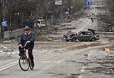Проведение специальной военной операции Вооруженных Сил России на Украине. Ситуация в Мариуполе. Пожилой мужчина едет на велосипеде на одной из улиц в Правобережном районе города.