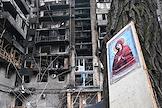 Проведение специальной военной операции Вооруженных Сил России на Украине. Ситуация в Мариуполе. Семистрельная икона Божией Матери на фоне сгоревшего многоэтажного жилого дома в Правобережном районе города.
