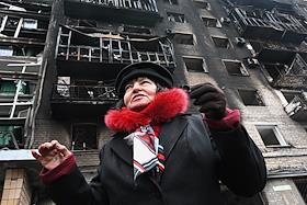 Проведение специальной военной операции Вооруженных Сил России на Украине. Ситуация в Мариуполе. Пожилая женщина у сгоревшего многоэтажного жилого дома в Правобережном районе города.