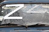 Проведение специальной военной операции Вооруженных Сил России на Украине. Ситуация в Мариуполе. Буква Z на простреленном стекле легкого автомобиля.