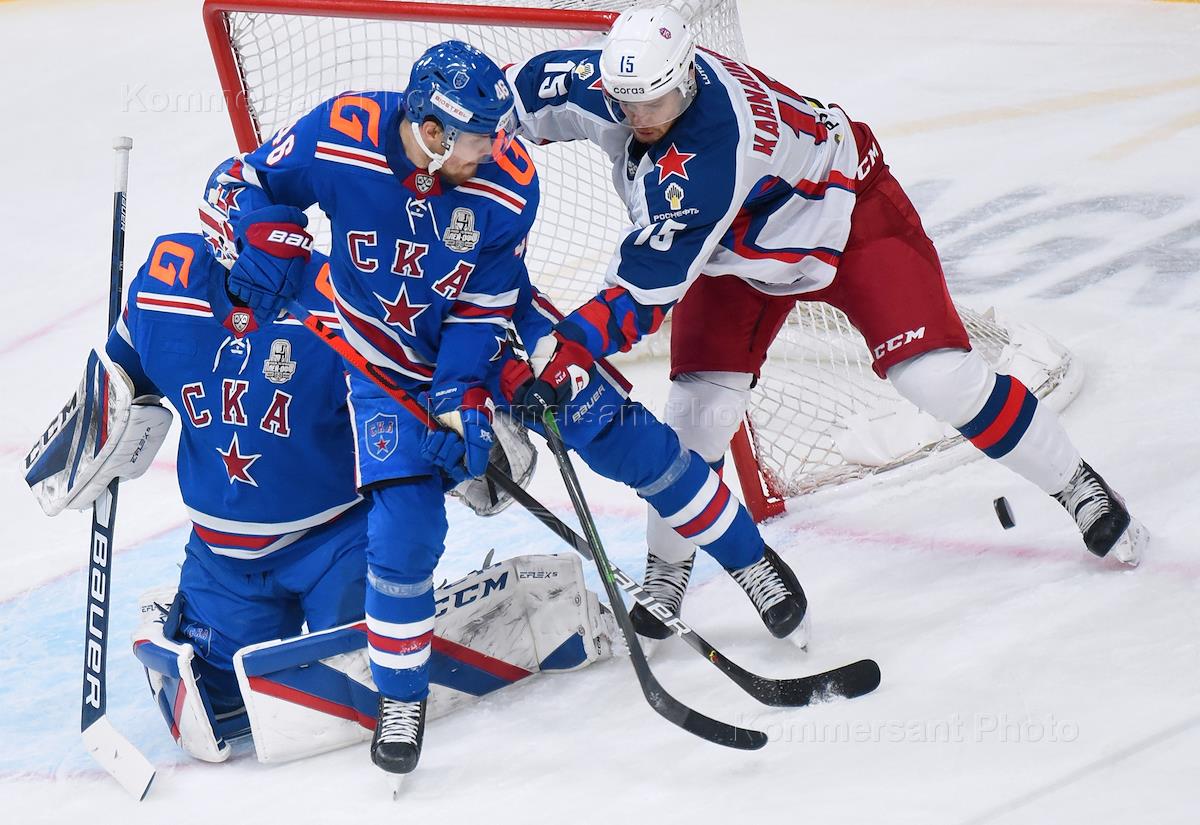 Континентальная хоккейная лига (КХЛ). Чемпионат сезона 2021/22. Финал - Запад. 7-й матч. Матч между командами СКА (Санкт-Петербург) - ЦСКА (Москва) на стадионе "Ледовый дворец". Игрок команды СКА Андрей Кузьменко (второй справа) и игрок команды ЦСКА Владислав Каменев (в центре) во время матча.