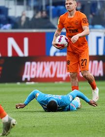 Российская Премьер-Лига (РПЛ). Тинькофф - Чемпионат России по футболу 2021/2022. 25-й тур. Матч между командами "Зенит" (Санкт-Петербург) - "Урал" (Екатеринбург) на стадионе "Газпром арена". Игрок команды "Урал" Иван Кузьмичёв (слева) во время матча.