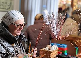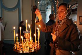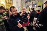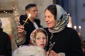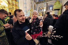 Празднование Входа Господня в Иерусалим (Вербное воскресение) в Воскресенском соборе Свято-Воскресенского Ново-Иерусалимского ставропигиального мужского монастыря. Священнослужитель и верующие во время обряда освящения вербы.