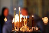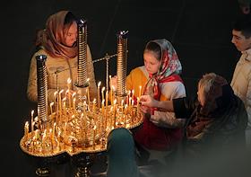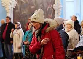 Празднование Входа Господня в Иерусалим (Вербное воскресение) в Воскресенском соборе Свято-Воскресенского Ново-Иерусалимского ставропигиального мужского монастыря. Верующие во время богослужения.