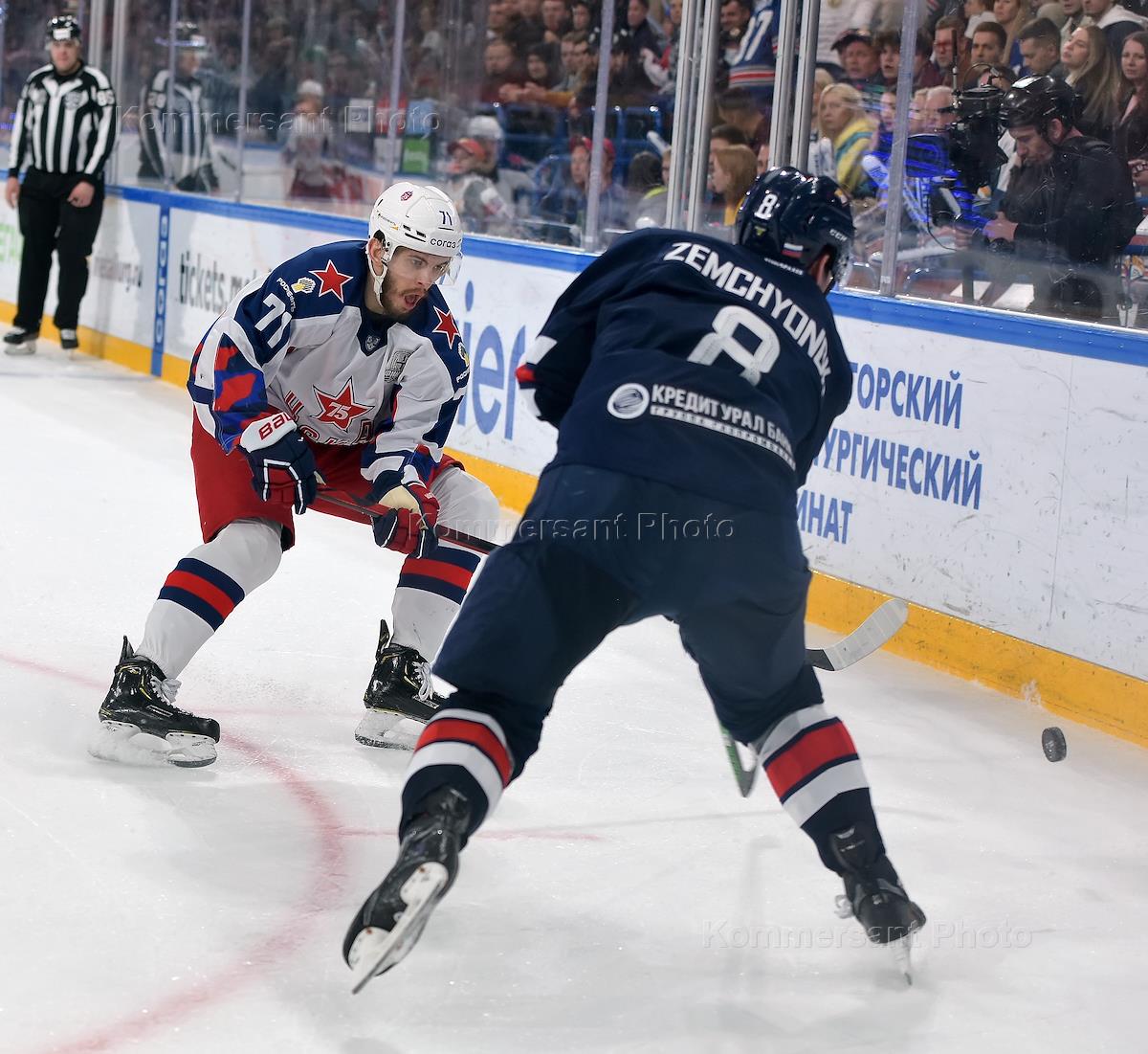 Континентальная хоккейная лига (КХЛ). Плей-офф. Финал Чемпионата. 2-й матч. Матч между командами "Металлург Мг" (Магнитогорск) - ЦСКА (Москва) на стадионе "Арена-Металлург". Игрок команды "Металлург" Артем Земчёнок (справа) и игрок команды ЦСКА Константин Окулов (слева) во время матча.