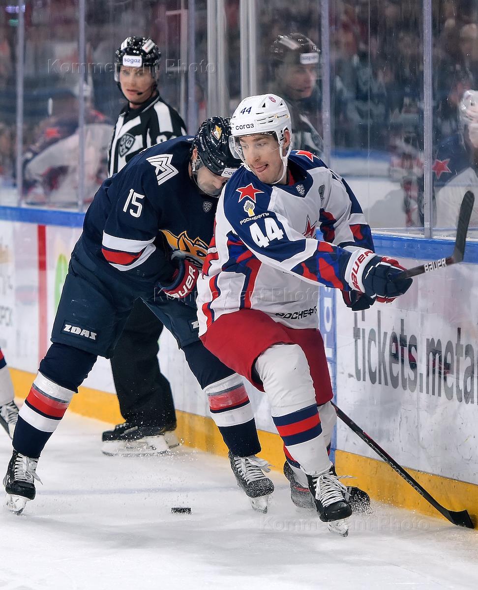 Континентальная хоккейная лига (КХЛ). Плей-офф. Финал Чемпионата. 2-й матч. Матч между командами "Металлург Мг" (Магнитогорск) - ЦСКА (Москва) на стадионе "Арена-Металлург". Игрок команды "Металлург" Архип Неколенко (справа) и игрок команды ЦСКА Клас Дальбек (слева) во время матча.