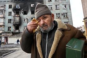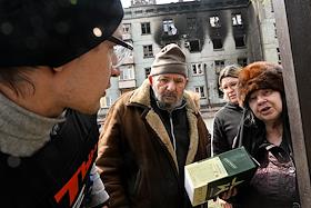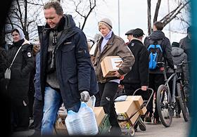 Проведение специальной военной операции Вооруженных Сил России на Украине. Ситуация в Мариуполе. Люди с коробками с едой и водой на улице города.