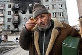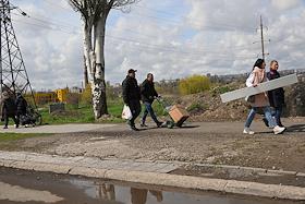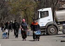 Проведение специальной военной операции Вооруженных Сил России на Украине. Ситуация в Мариуполе. Местные жители с пластиковыми булками с водой идут по улице города.