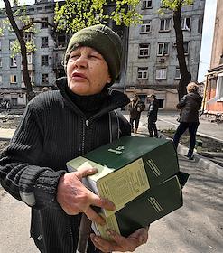 Проведение специальной военной операции Вооруженных Сил России на Украине. Ситуация в Мариуполе. Раздача гуманитарной помощи местным жителям на Никопольском проспекте участниками гражданской волонтерской инициативы "Тыл-22". Местная жительница у разбитого дома с набором гуманитарной помощи.