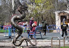 Проведение специальной военной операции Вооруженных Сил России на Украине. Ситуация в Мариуполе. Люди на улице. Скульптура "Дракон" в парке.
