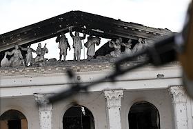 Проведение специальной военной операции Вооруженных Сил России на Украине. Ситуация в Мариуполе. Сгоревшее здание Донецкого академического областного драматического театра после обстрела.