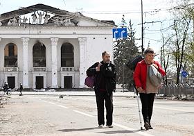 Проведение специальной военной операции Вооруженных Сил России на Украине. Ситуация в Мариуполе. Сгоревшее здание Донецкого академического областного драматического театра после обстрела. Пожилые люди идут по улице.