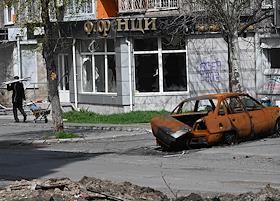 Проведение специальной военной операции Вооруженных Сил России на Украине. Ситуация в Мариуполе. Сгоревший автомобиль на улице. Разбитые окна в здании магазина "Флоренция".