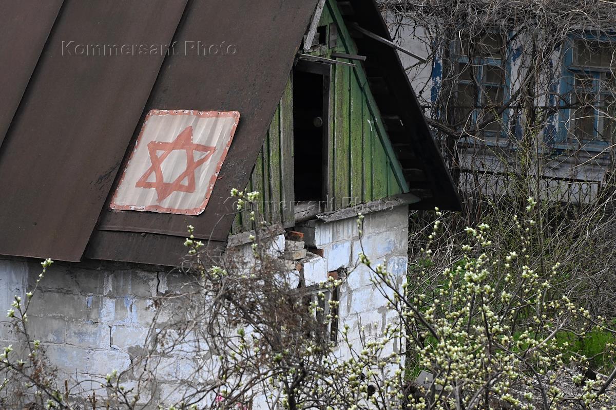 Проведение специальной военной операции Вооруженных Сил России на Украине. Ситуация в Мариуполе. Жанровая фотография. Знак "Звезда Давида" на крыше жилого частного дома.