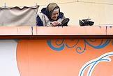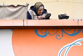 Проведение специальной военной операции Вооруженных Сил России на Украине. Ситуация в Мариуполе. Жанровая фотография. Пожилая женщина на балконе своей квартиры клеит обувь.