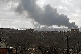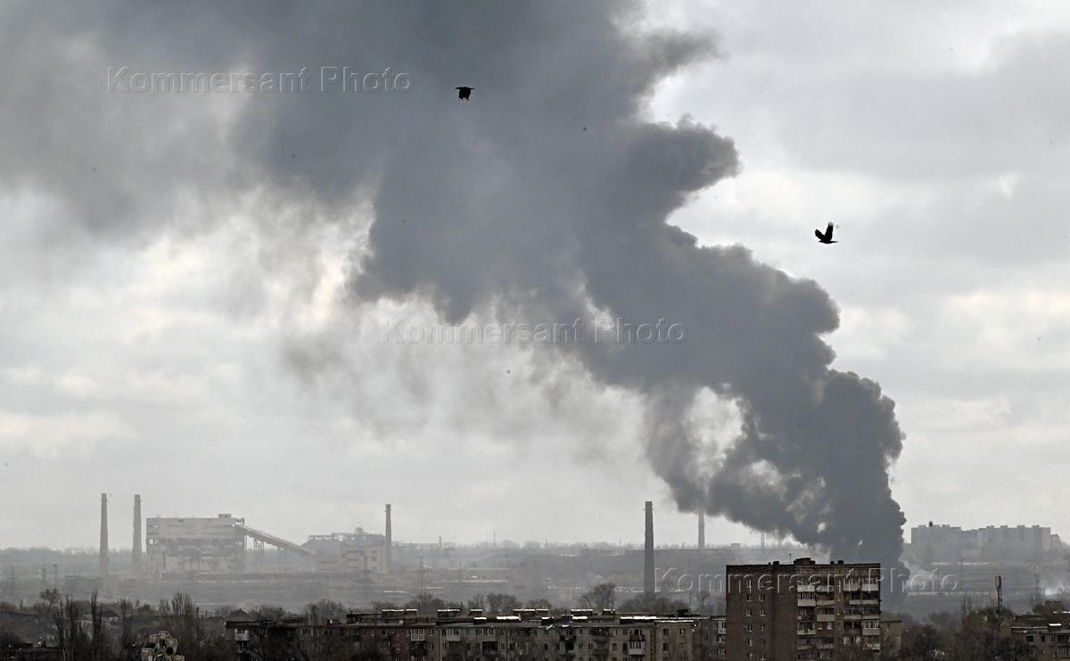 Проведение специальной военной операции Вооруженных Сил России на Украине. Ситуация в Мариуполе. Вид на территорию металлургического комбината "Азовсталь". Дым над территорией.