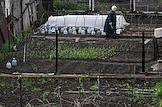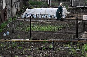 Проведение специальной военной операции Вооруженных Сил России на Украине. Ситуация в Мариуполе. Женщина работает в своем огороде у себя дома.