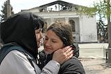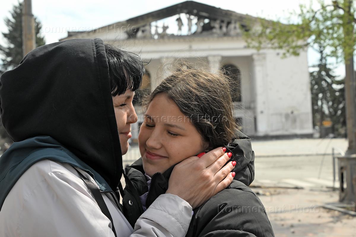 Проведение специальной военной операции Вооруженных Сил России на Украине. Ситуация в Мариуполе. Сгоревшее здание Донецкого академического областного драматического театра после обстрела. Женщина с девочкой на улице.