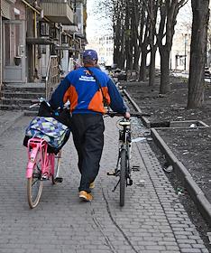 Проведение специальной военной операции Вооруженных Сил России на Украине. Ситуация в Мариуполе. Мужчина катит два велосипеда по улице города.