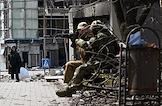 Проведение специальной военной операции Вооруженных Сил России на Украине. Ситуация в Мариуполе. Сгоревшее здание Донецкого академического областного драматического театра после обстрела. Бойцы спецназа ДНР во время патрулирования улиц города.