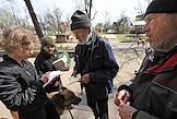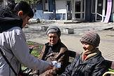 Проведение специальной военной операции Вооруженных Сил России на Украине. Ситуация в Мариуполе. Жанровая фотография. Женщина раздает российские рубли пожилым женщинам, которые сидят на лавочке на улице.