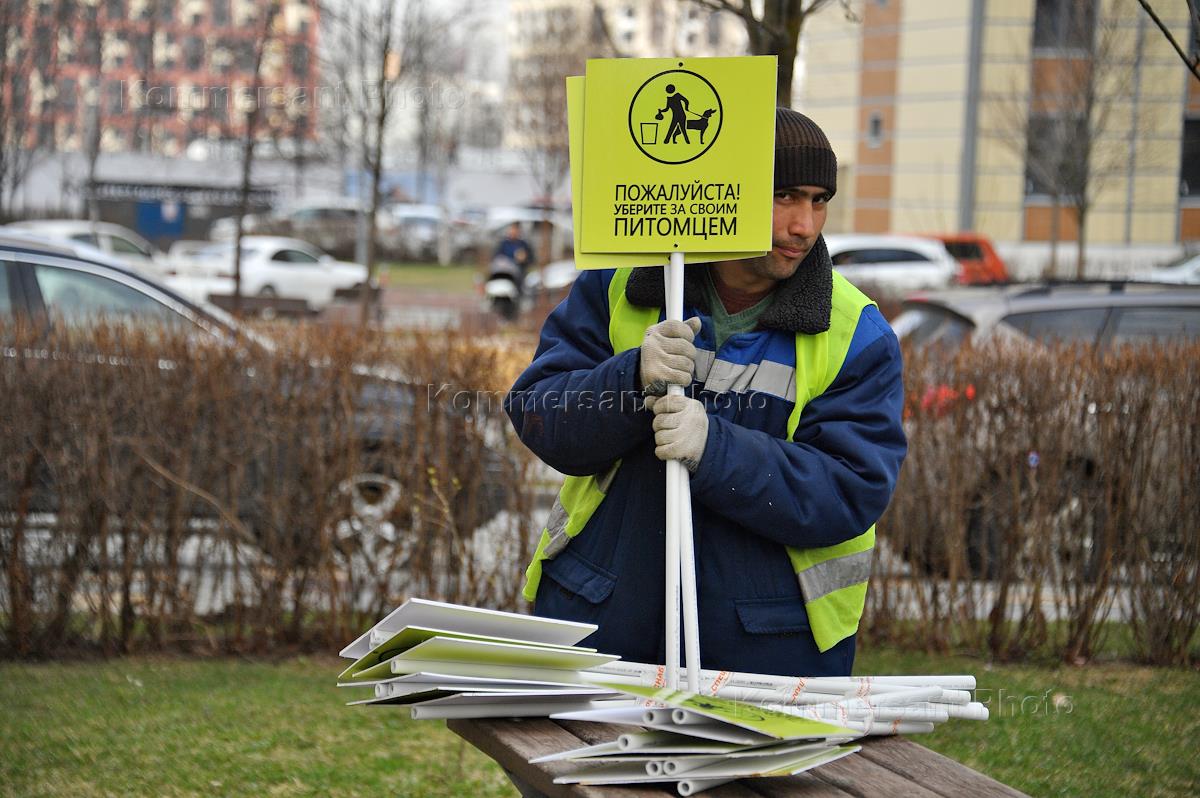 Виды Москвы. Западное Дегунино. Жанровая фотография. Сотрудник коммунальной службы с табличками "Пожалуйста! Убирайте за своим питомцем!".