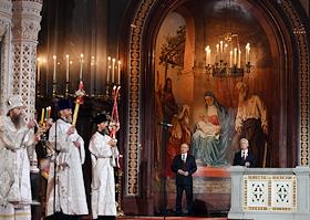 Праздничное Пасхальное богослужение в кафедральном соборном храме Христа Спасителя. Апостольский нунций в России (посол Ватикана) архиепископ Джованни Д'Аньелло (второй слева сидит) и архиепископ-митрополит католической епархии Божией Матери в Москве Паоло Пецци (второй справа сидит) перед началом богослужения.